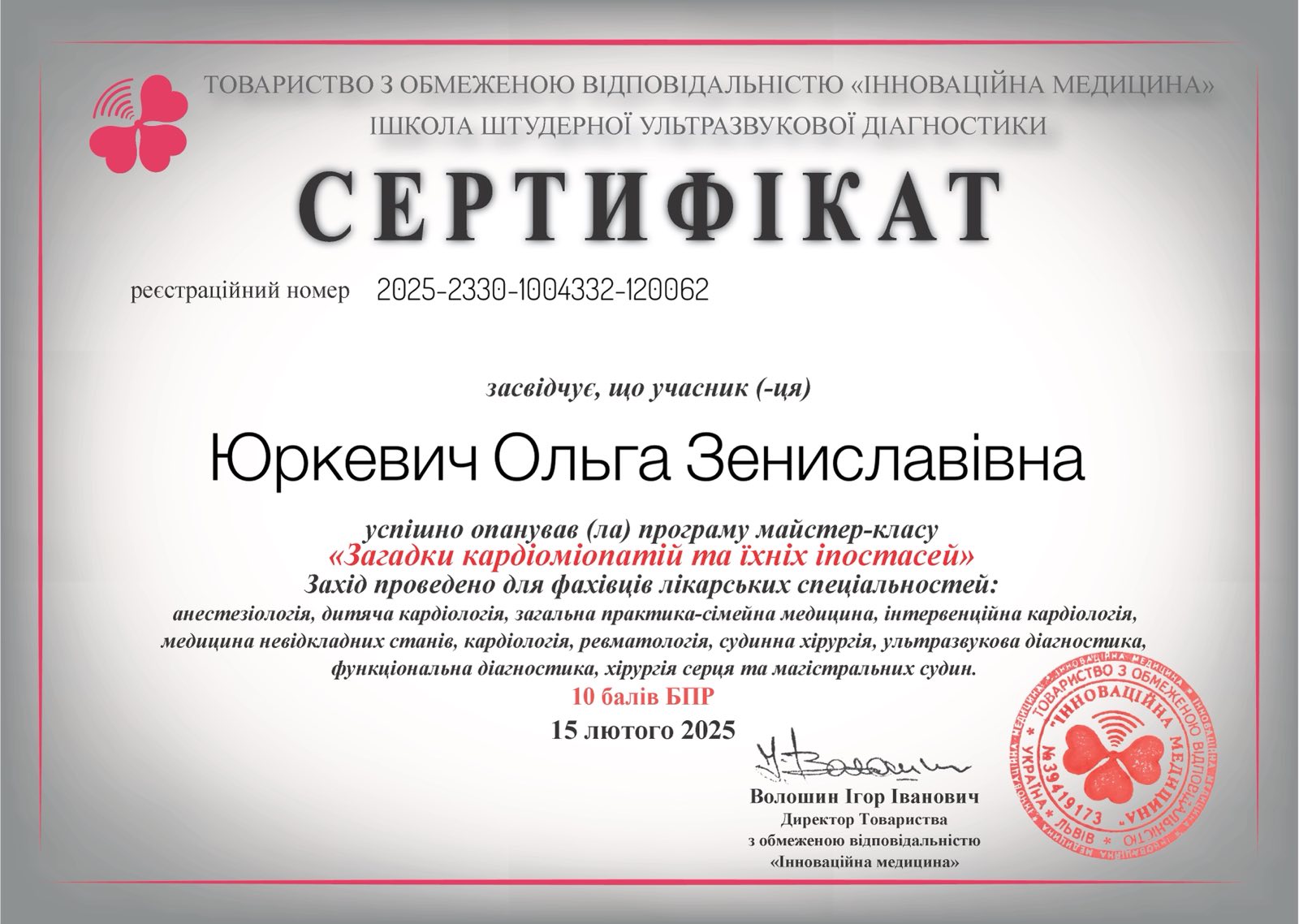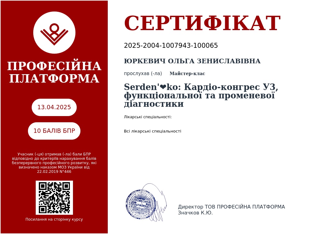Маючи досвід роботи з понад 800 пацієнтами з ІХС та 90+ випадками гострого інфаркту міокарда за рік (статистика 2017 р.), Ольга Зениславівна фокусується на точній діагностиці, негайному реагуванні та просвітницькій роботі для запобігання фатальним наслідкам.